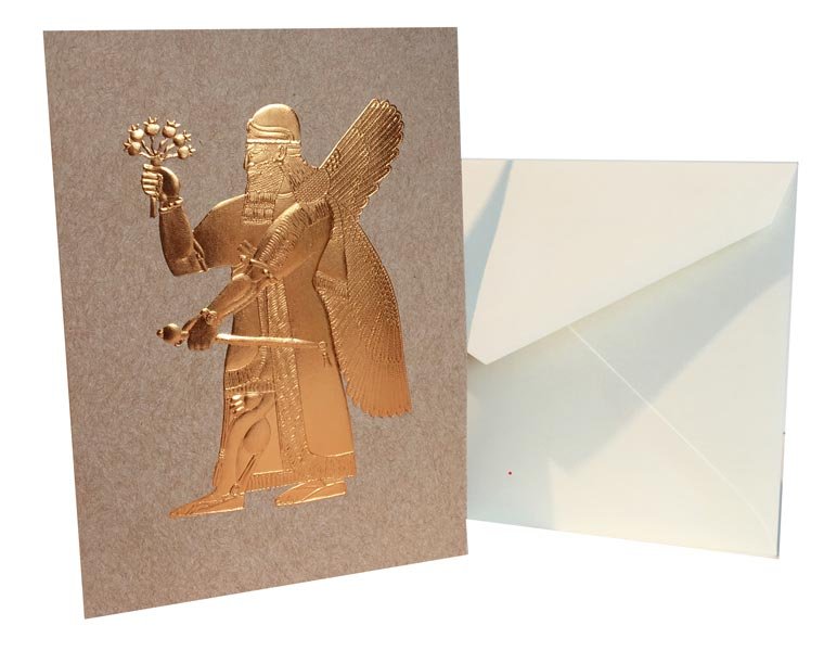Assyrian Note Card featuring Winged Divinity from the relief in the palace of Ashurnasirpal II in copper foil on recycled paper. Comes with envelope and is blank inside.